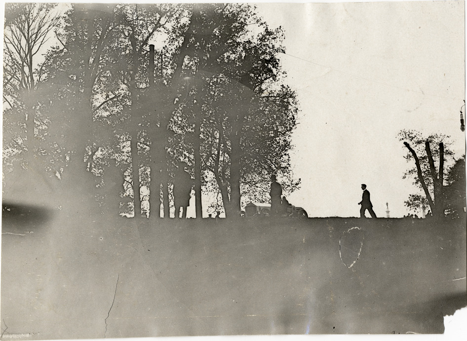 Distant view of spectators watching car racing on course during the 1908 Fairmount Park races in Philadelphia, Pennsylvania. Handwritten on back: "Races and racing--Fairmount Park races, 1908."