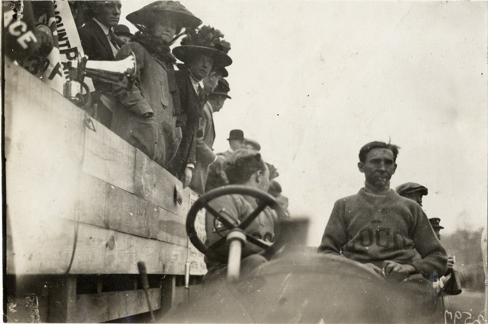 George Robertson and passenger in Locomobile racecar, 1908 Fairmount Park races