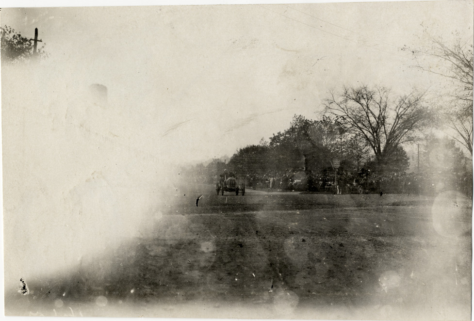 Distant view of George Robertson and passenger in Locomobile car no. 10 during lap 22 at the 1908 Fairmount Park races in Philadelphia, Pennsylvania. Spectators watch from roadside. Handwritten on back: "Loco on 22nd lap. Races and racing--Fairmount Park races, 1908."