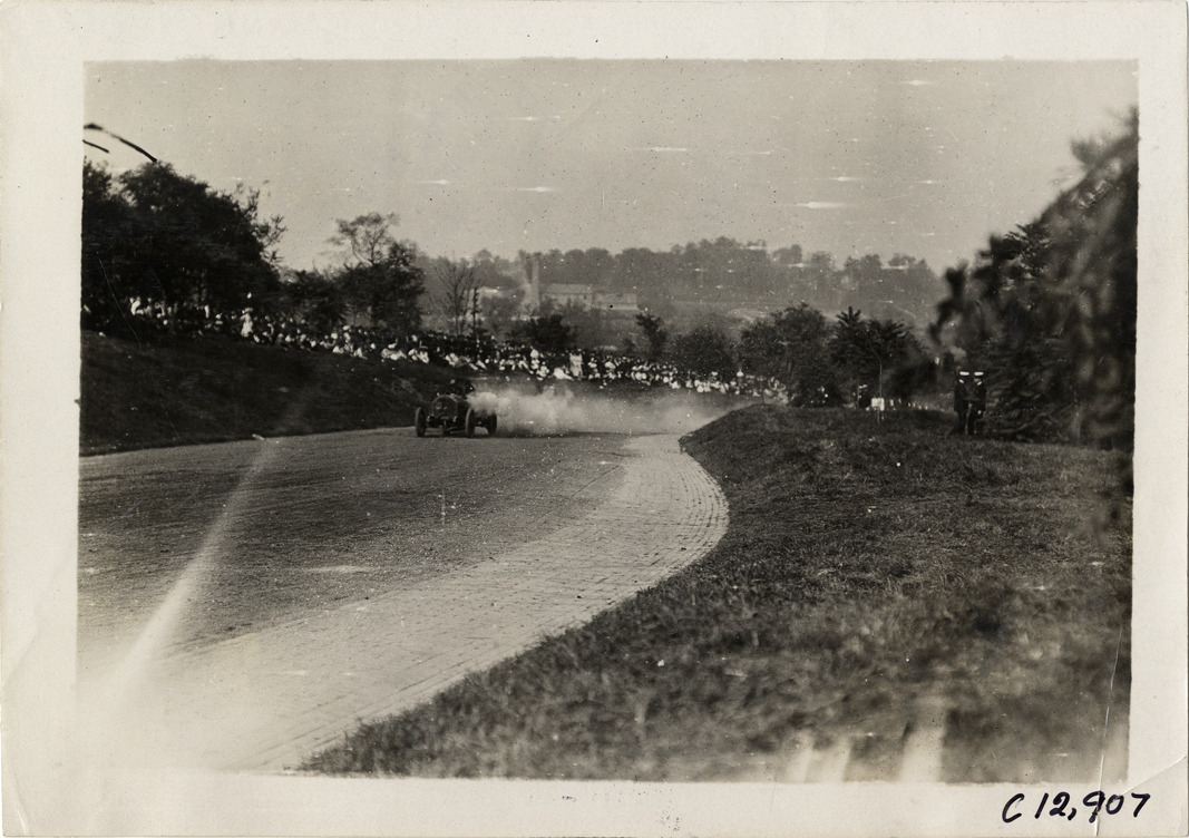Distant view of driver and passenger racing car on course during the 1909 Fairmount Park races in Philadelphia, Pennsylvania. Spectators watch from roadside. Stamped on back: "Photo by Spooner & Wells, Inc. 1931 Broadway, N.Y." Handwritten on back: "Races and racing--Fairmount Park races, 1909."