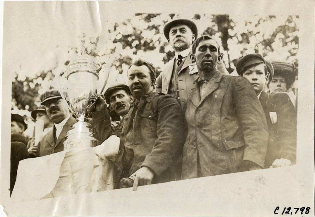 George Robertson posing with trophy cup, 1909 Fairmount Park races