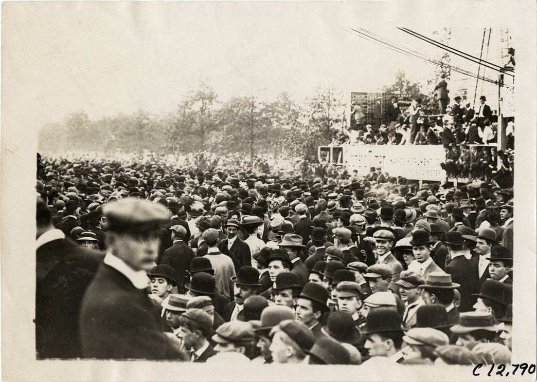 View of crowd during the 1909 Fairmount Park races in Philadelphia, Pennsylvania. Stamped on back: "Photo by Spooner & Wells, Inc. 1931 Broadway, N.Y." Handwritten on back: "Races and racing--Fairmount Park races, 1909."
