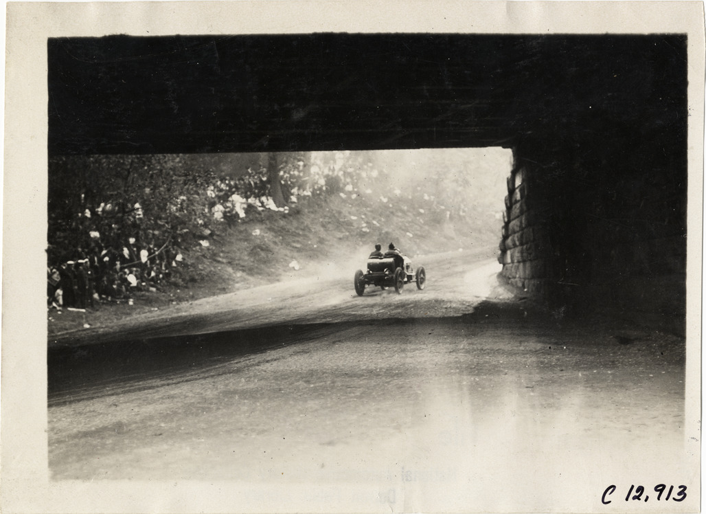 Rear view of driver and passenger racing car under bridge during the 1909 Fairmount Park races in Philadelphia, Pennsylvania. Stamped on back: "Photo by Spooner & Wells, Inc. 1931 Broadway, N.Y." Handwritten on back: "Races and racing--Fairmount Park races, 1909."