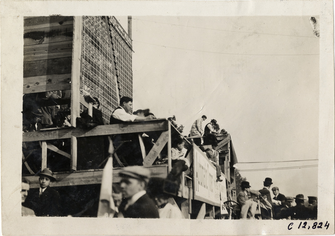 View of men on platform in front of scoreboard during the 1909 Fairmount Park races in Philadelphia, Pennsylvania. Stamped on back: "Photo by Spooner & Wells, Inc. 1931 Broadway, N.Y." Handwritten on back: "Races and racing--Fairmount Park races, 1909."