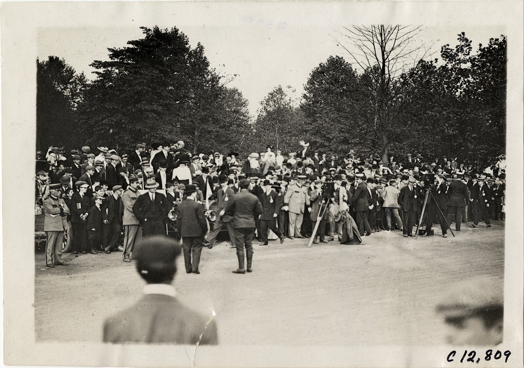 Spectators and photographers on roadside, 1909 Fairmount Park races