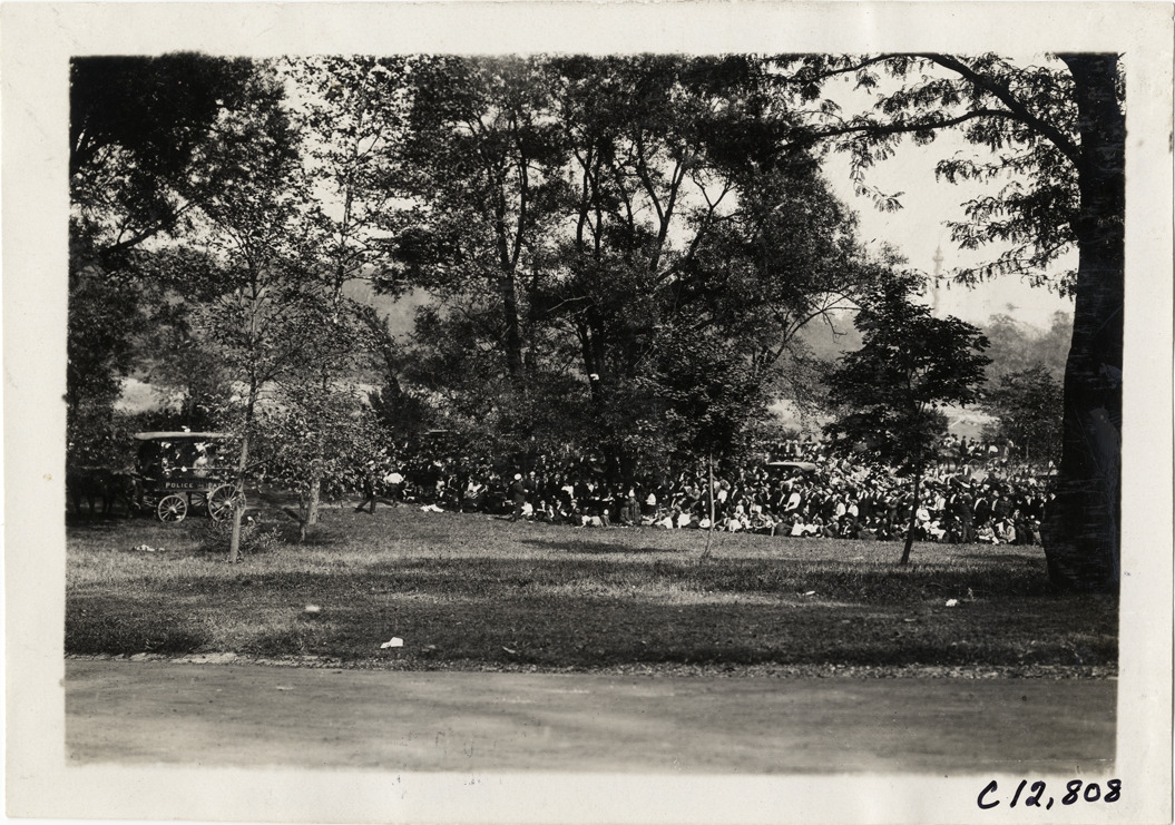 View of spectators on roadside during the 1909 Fairmount Park races in Philadelphia, Pennsylvania. Horse-drawn police patrol wagon on left. Stamped on back: "Photo by Spooner & Wells, Inc. 1931 Broadway, N.Y." Handwritten on back: "Races and racing--Fairmount Park races, 1909."