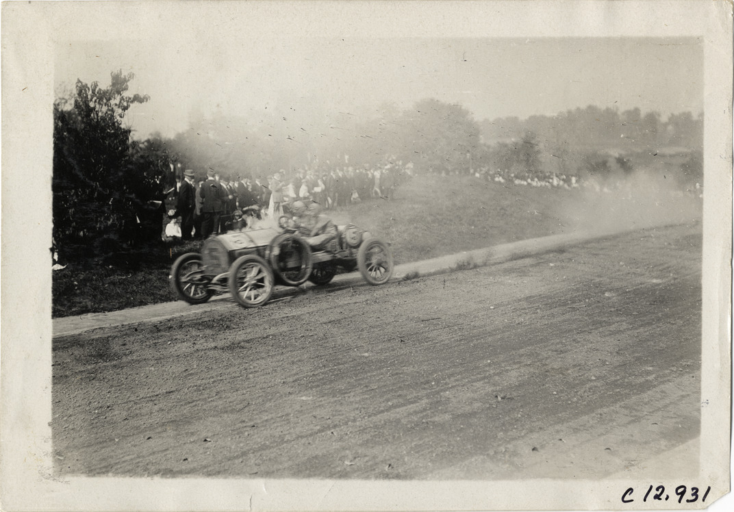 Distant view of driver and passenger racing car no. 5 on course during the 1909 Fairmount Park races in Philadelphia, Pennsylvania. Spectators watch from roadside. Stamped on back: "Photo by Spooner & Wells, Inc. 1931 Broadway, N.Y." Handwritten on back: "Races and racing--Fairmount Park races, 1909."