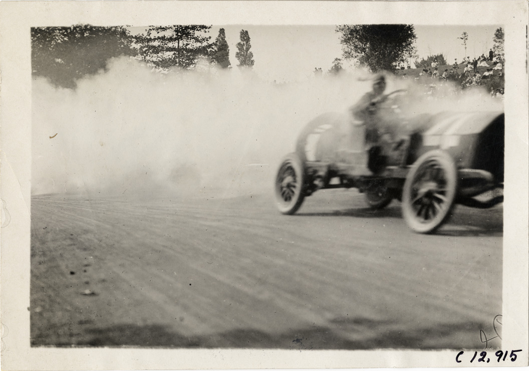 View of driver racing car no. 4 on course during the 1909 Fairmount Park races in Philadelphia, Pennsylvania. Cloud of smoke trails from car; spectators watch from roadside. Stamped on back: "Photo by Spooner & Wells, Inc. 1931 Broadway, N.Y." Handwritten on back: "Races and racing--Fairmount Park races, 1909."