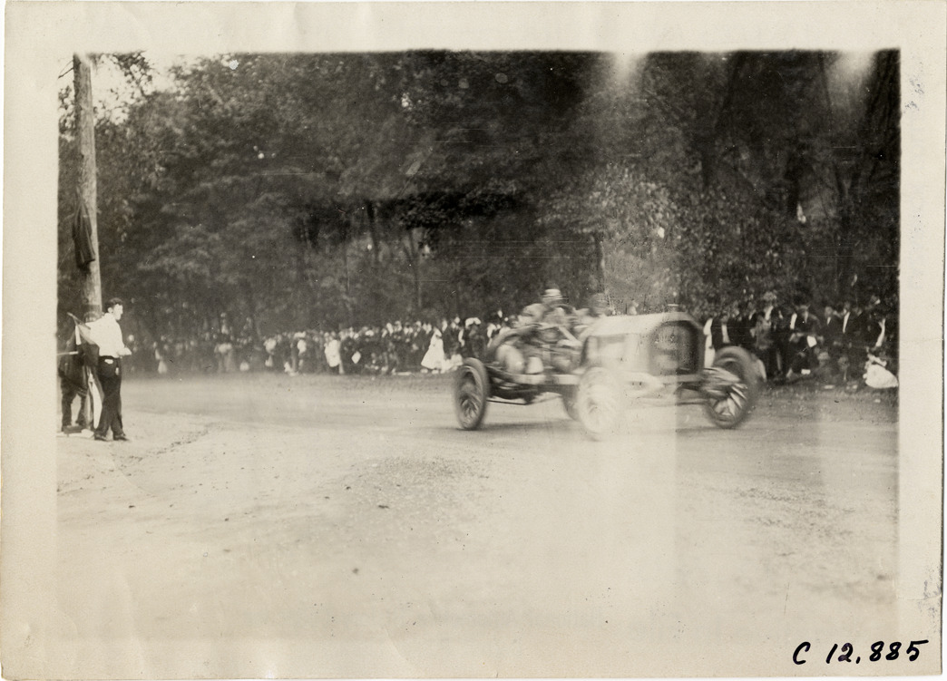 View of driver and passenger racing car no. 9 on course during the 1909 Fairmount Park races in Philadelphia, Pennsylvania. Spectators watch from roadside. Stamped on back: "Photo by Spooner & Wells, Inc. 1931 Broadway, N.Y." Handwritten on back: "Races and racing--Fairmount Park races, 1909."