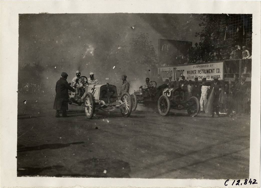 View of cars no. 22 and no. 23 waiting at starting line during the 1909 Fairmount Park races in Philadelphia, Pennsylvania. Scoreboard and spectators in background. Stamped on back: "Photo by Spooner & Wells, Inc. 1931 Broadway, N.Y." Handwritten on back: "Races and racing--Fairmount Park races, 1909."