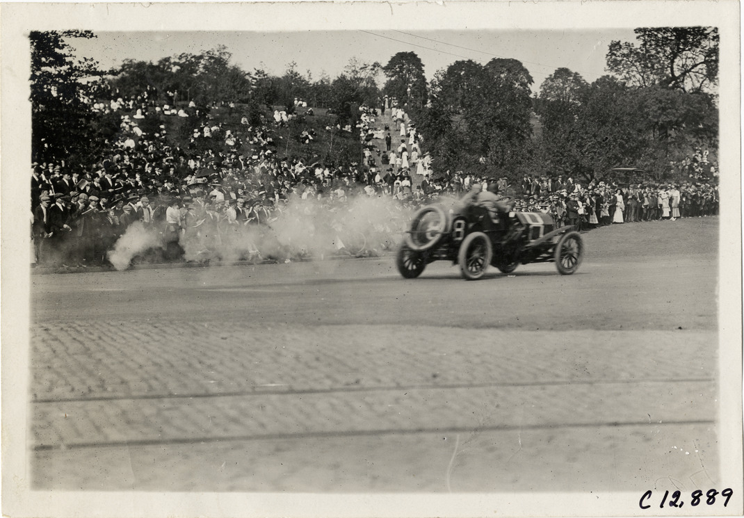 View of driver and passenger racing car no. 8 on course during the 1909 Fairmount Park races in Philadelphia, Pennsylvania. Spectators watch from roadside. Stamped on back: "Spooner & Wells, Inc., photographers, telephones 3472-3473 Columbus, 1931 Broadway, New York." Handwritten on back: "Races and racing--Fairmount Park races, 1909."
