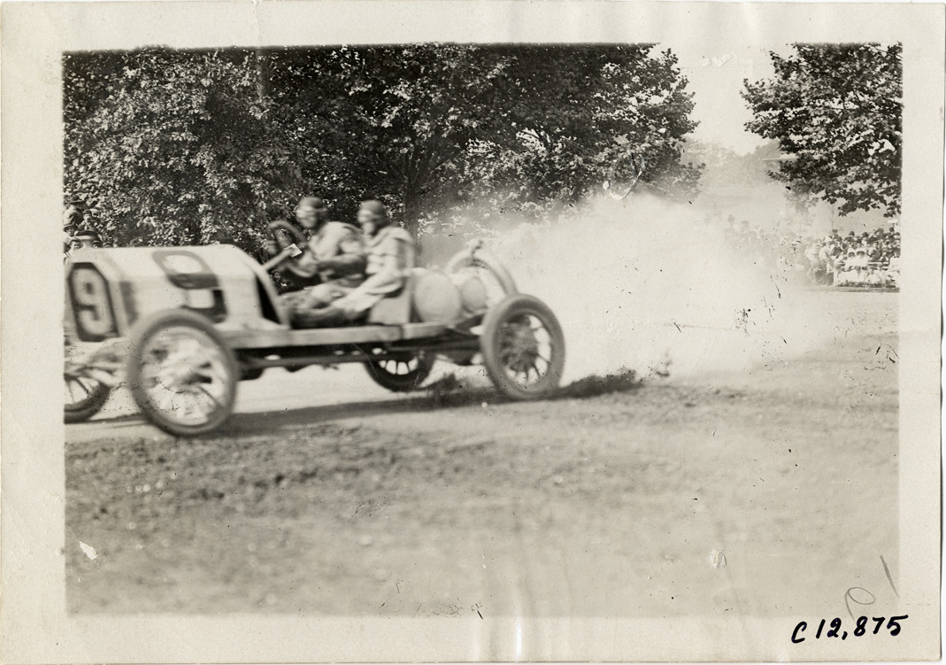 View of driver and passenger racing car no. 9 on course during the 1909 Fairmount Park races in Philadelphia, Pennsylvania. Spectators watch from roadside. Stamped on back: "Photo by Spooner & Wells, Inc. 1931 Broadway, N.Y." Handwritten on back: "Races and racing--Fairmount Park races, 1909."