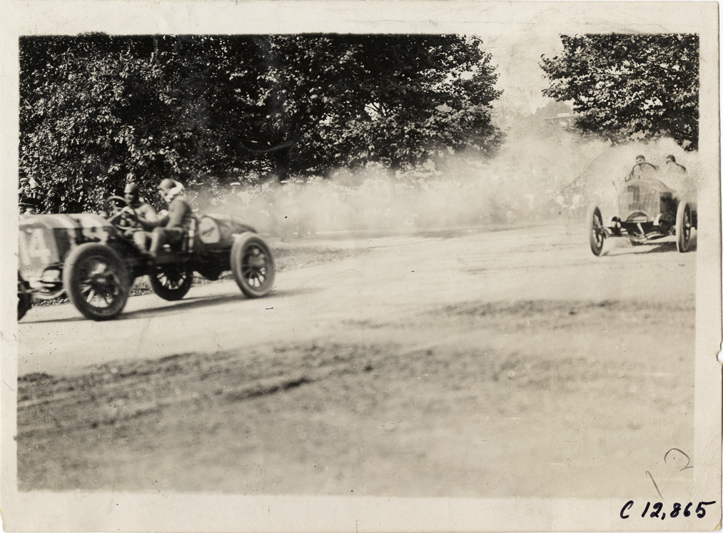 View of cars no. 14 and no. 1 racing on course during the 1909 Fairmount Park races in Philadelphia, Pennsylvania. Spectators watch race from roadside. Stamped on back: "Photo by Spooner & Wells, Inc. 1931 Broadway, N.Y." Handwritten on back: "Races and racing--Fairmount Park races, 1909."