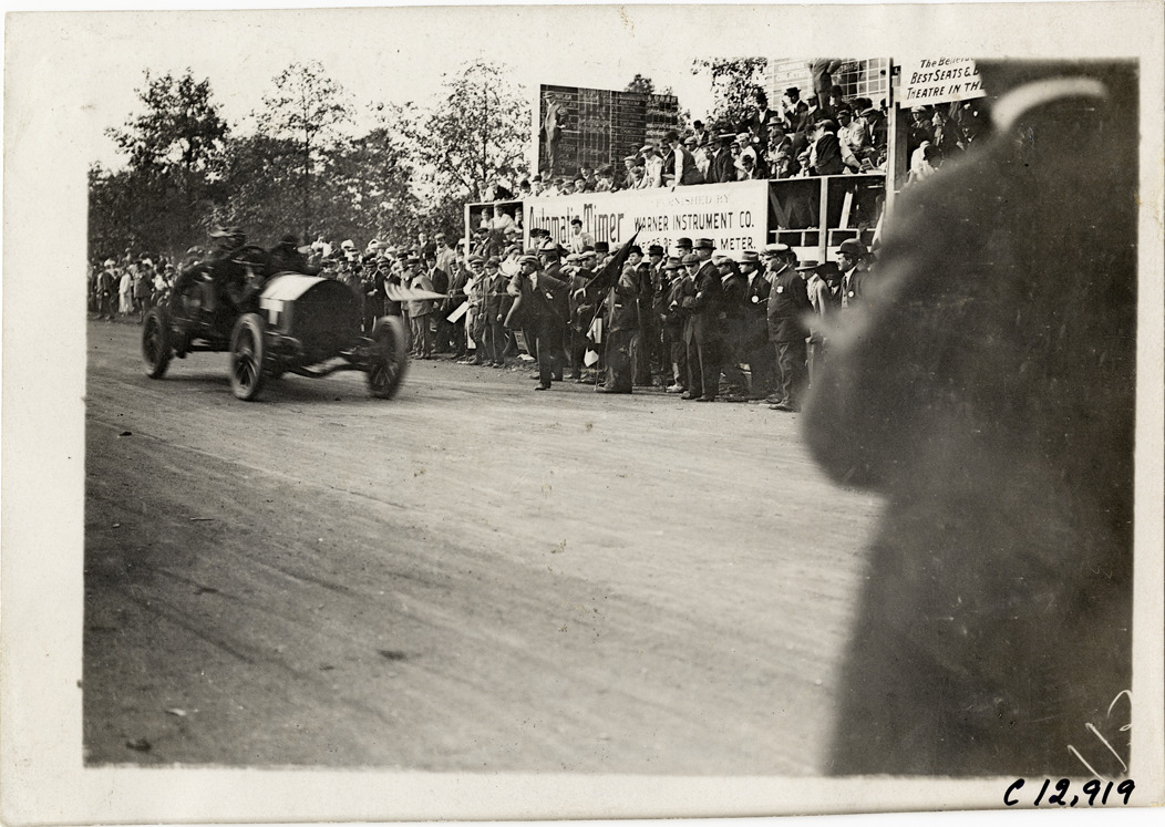 Racecar crossing finish line, 1909 Fairmount Park races