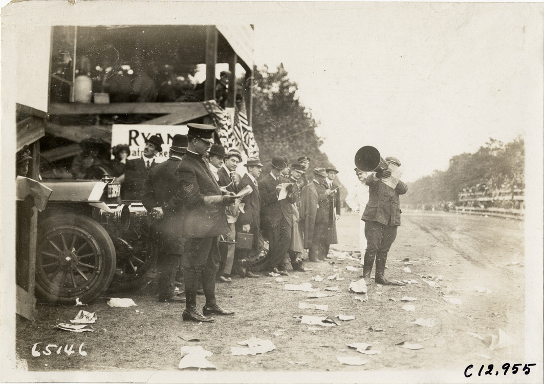 View of announcer speaking into megaphone during the 1910 Fairmount Park races in Philadelphia, Pennsylvania. Police officers and other spectators stand in front of reviewing stand on left; ground is littered with paper. Stamped on back: "Spooner & Wells, Inc., photographers, telephones 3472-3473 Columbus, 1931 Broadway, New York." Handwritten on back: "Races and racing--Fairmount Park races, 1910."