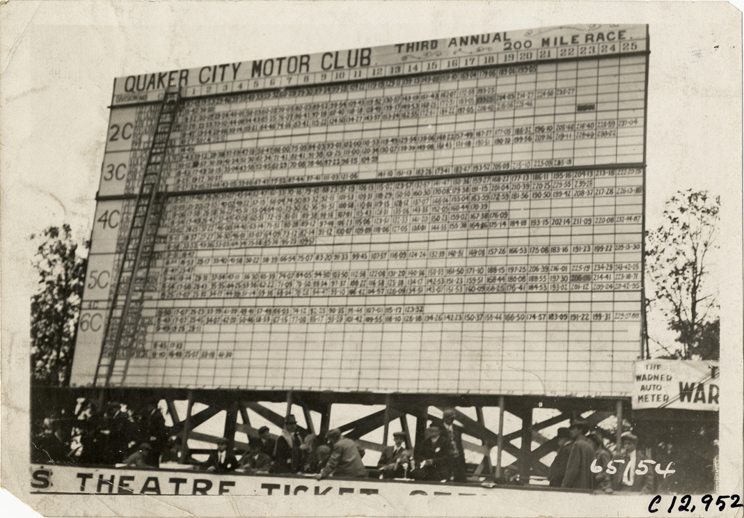 View of scoreboard at the 1910 Fairmount Park races in Philadelphia, Pennsylvania. "Quaker City Motor Club, Third Annual 200 mile race" painted on scoreboard. Stamped on back: "Spooner & Wells, Inc., photographers, telephones 3472-3473 Columbus, 1931 Broadway, New York." Handwritten on back: "Races and racing--Fairmount Park races, 1910."