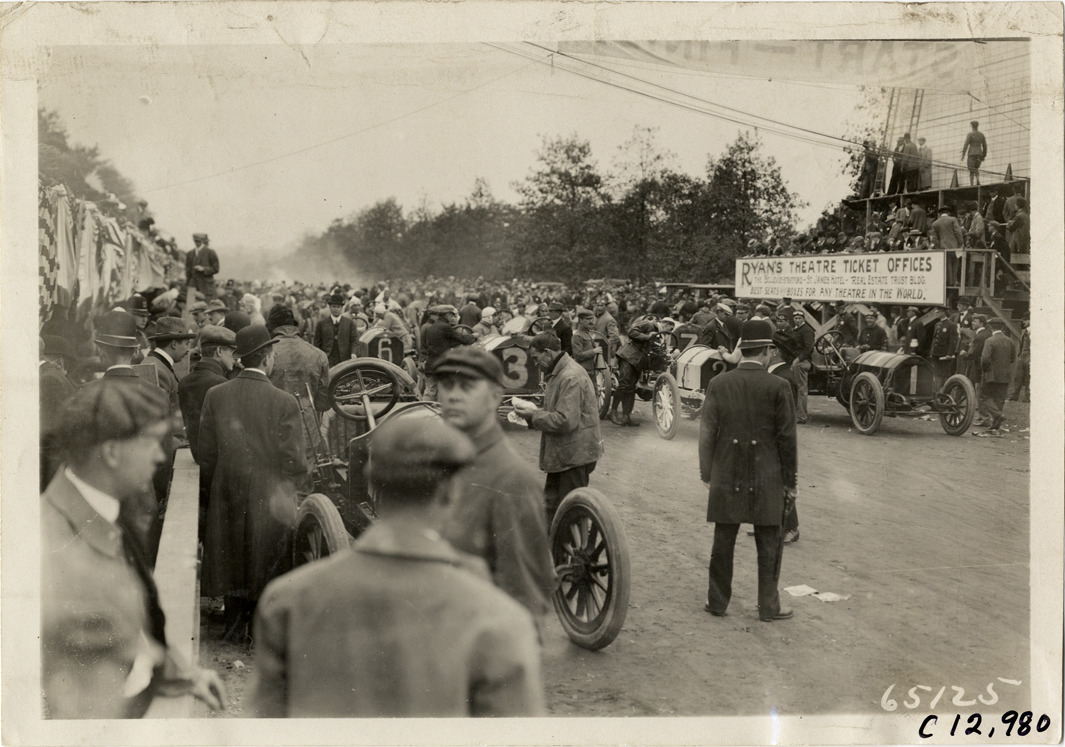 Crowd and racecars on track, 1910 Fairmount Park races