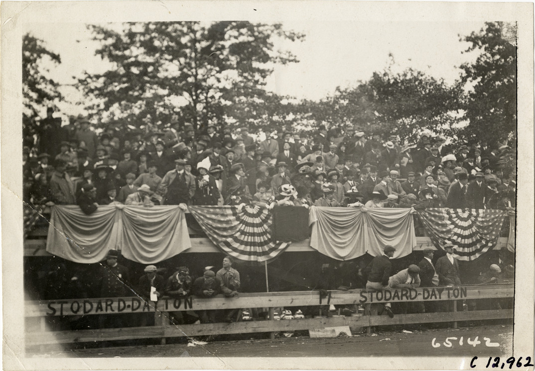 View of pit crew and policeman standing behind pit railing and spectators in bleachers during the 1910 Fairmount Park races in Philadelphia, Pennsylvania. "17, Stodard [sic]-Dayton" painted on pit railing. Front of bleachers is decorated with bunting. Stamped on back: "Spooner & Wells, Inc., photographers, telephones 3472-3473 Columbus, 1931 Broadway, New York." Handwritten on back: "Races and racing--Fairmount Park races, 1910."