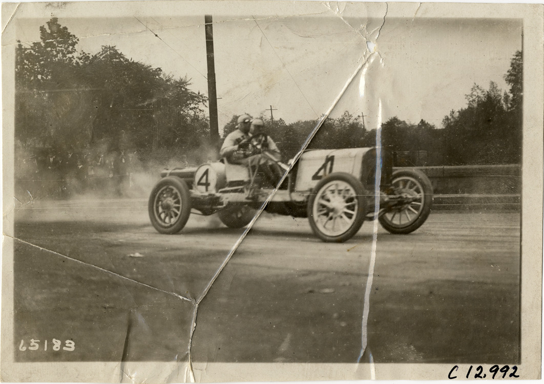 View of driver and passenger racing car no. 4 on course during the 1910 Fairmount Park races in Philadelphia, Pennsylvania. Stamped on back: "Spooner & Wells, Inc., photographers, telephones 3472-3473 Columbus, 1931 Broadway, New York." Handwritten on back: "Races and racing--Fairmount Park races, 1910."