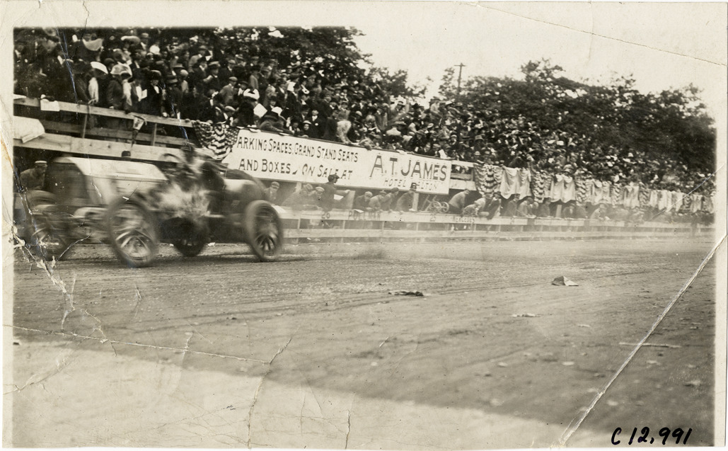 Racecar passing spectators in bleachers, 1910 Fairmount Park races