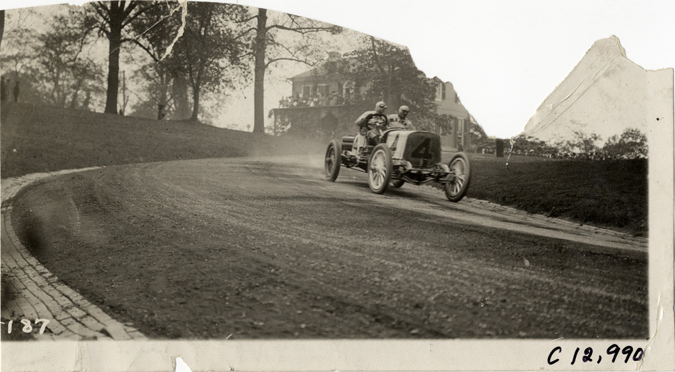 View of driver and passenger racing car no. 4 on course during the 1910 Fairmount Park races in Philadelphia, Pennsylvania. House in background. Stamped on back: "Spooner & Wells, Inc., photographers, telephones 3472-3473 Columbus, 1931 Broadway, New York." Handwritten on back: "Races and racing--Fairmount Park races, 1910."