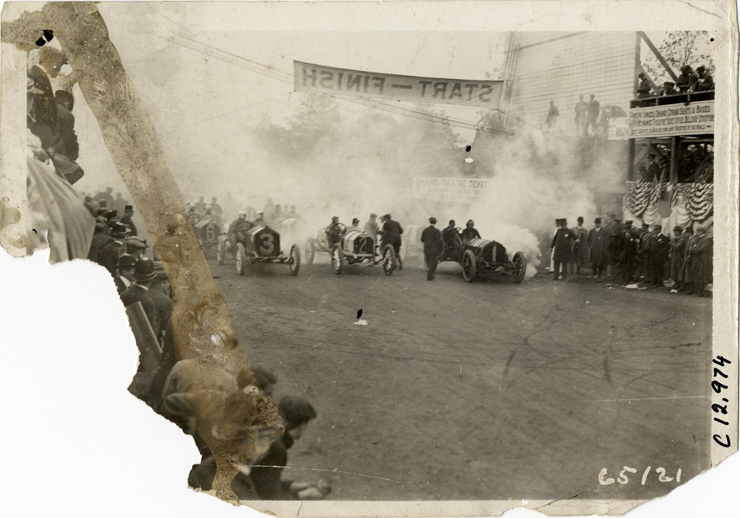 Racecars waiting at starting line, 1910 Fairmount Park races