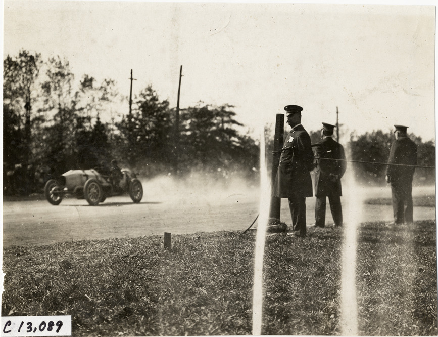 View of Joe Jagersberger driving Case car no. 7 past group of policemen during the 1911 Fairmount Park races in Philadelphia, Pennsylvania. Stamped on back: "Spooner & Wells, Inc., photographers, telephones 3472-3473 Columbus, 1931 Broadway, New York." Handwritten on back: "Jagersberger, Case. Races and racing--Fairmount Park races, 1911."