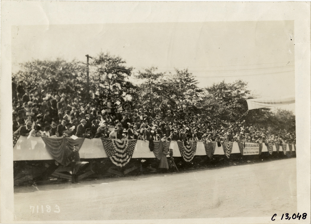View of crowd of spectators in stands during the 1911 Fairmount Park races in Philadelphia, Pennsylvania. Railing is decorated with bunting. Stamped on back: "Spooner & Wells, Inc., photographers, telephones 3472-3473 Columbus, 1931 Broadway, New York." Handwritten on back: "Races and racing--Fairmount Park races, 1911."