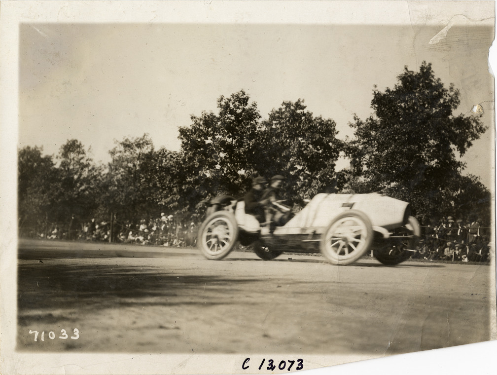 View of Joe Jagersberger and passenger racing Case car no. 7 on course during the 1911 Fairmount Park races in Philadelphia, Pennsylvania. Spectators watch from roadside. Stamped on back: "Spooner & Wells, Inc., photographers, telephones 3472-3473 Columbus, 1931 Broadway, New York." Handwritten on back: "Jagersberger, Case. Races and racing--Fairmount Park races, 1911."