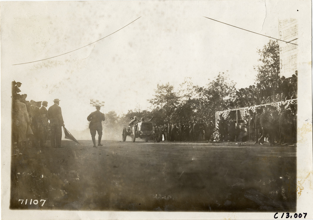 Ralph Mulford and passenger crossing finish line in Lozier racecar, 1911 Fairmount Park races