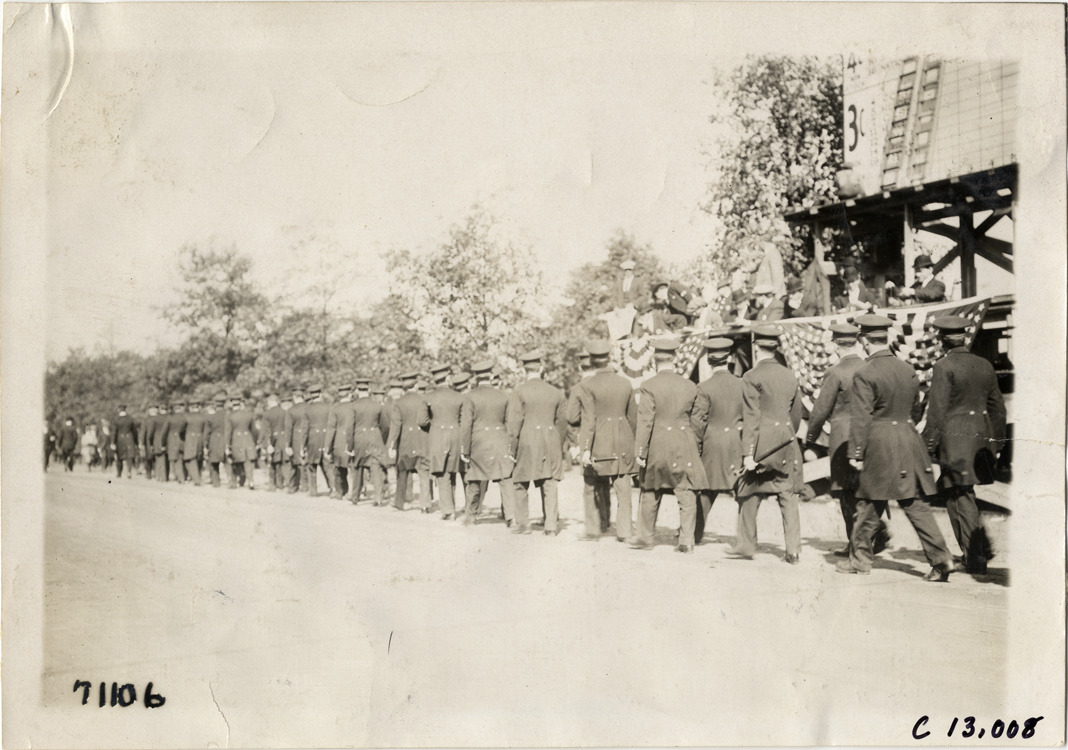 Rear view of police officers walking in line in front of scoreboard during the 1911 Fairmount Park races in Philadelphia, Pennsylvania. Stamped on back: "Spooner & Wells, Inc., photographers, telephones 3472-3473 Columbus, 1931 Broadway, New York." Handwritten on back: "Races and racing--Fairmount Park races, 1911."