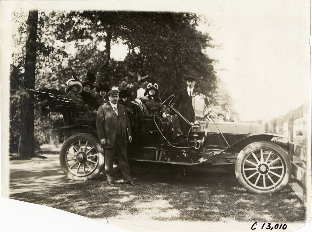 View of group of men and women with automobile on roadside during the 1911 Fairmount Park races in Philadelphia, Pennsylvania. Stamped on back: "Spooner & Wells, Inc., photographers, telephones 3472-3473 Columbus, 1931 Broadway, New York." Handwritten on back: "Races and racing--Fairmount Park races, 1911."