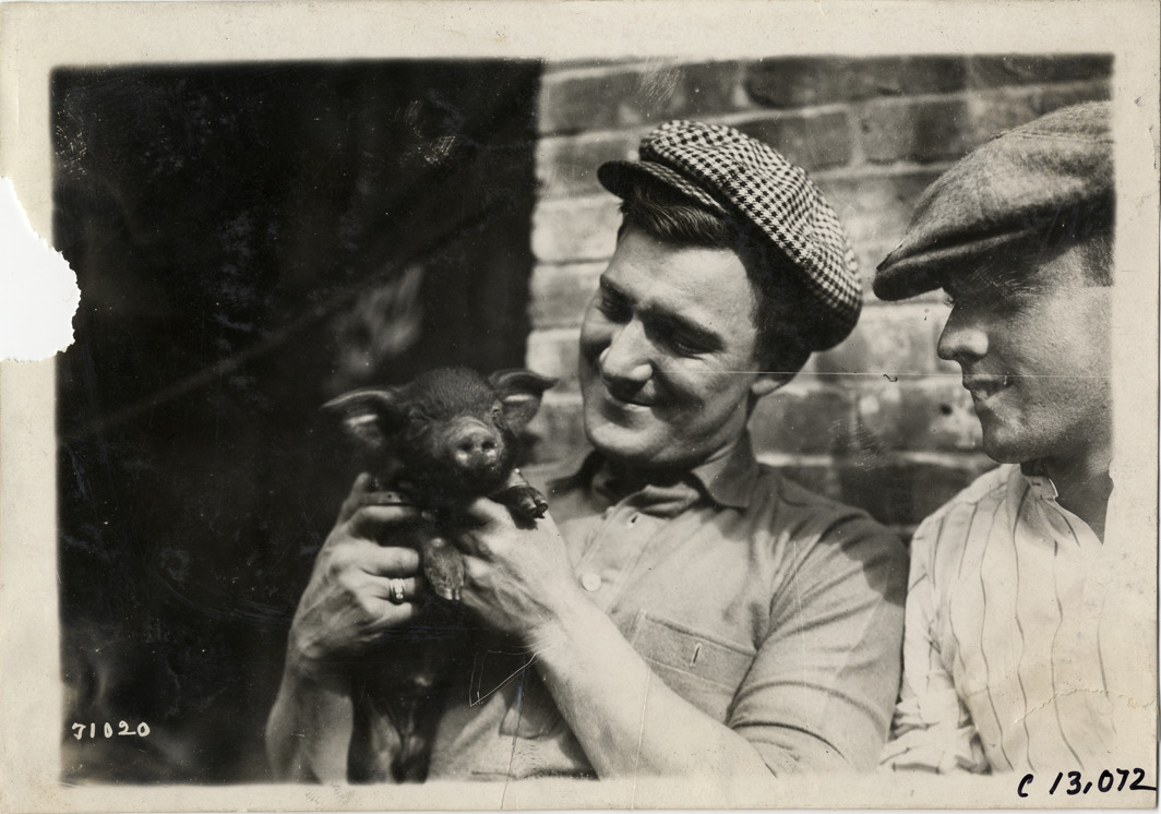 View of man holding piglet, sitting next to second man, during the 1911 Fairmount Park races in Philadelphia, Pennsylvania. Stamped on back: "Spooner & Wells, Inc., photographers, telephones 3472-3473 Columbus, 1931 Broadway, New York." Handwritten on back: "Races and racing--Fairmount Park races, 1911."