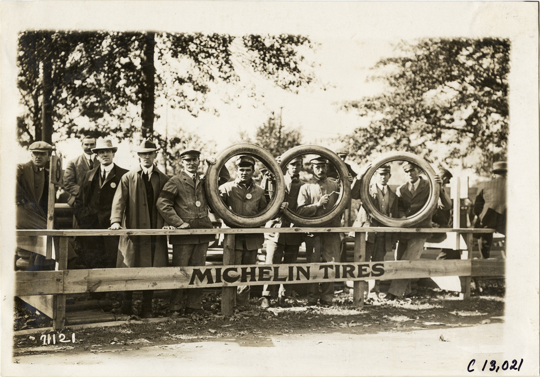 View of group of men posing with three Michelin tires behind fence during the 1911 Fairmount Park races in Philadelphia, Pennsylvania. "Michelin tires" painted on fence railing. Stamped on back: "Spooner & Wells, Inc., photographers, telephones 3472-3473 Columbus, 1931 Broadway, New York." Handwritten on back: "Races and racing--Fairmount Park races, 1911."
