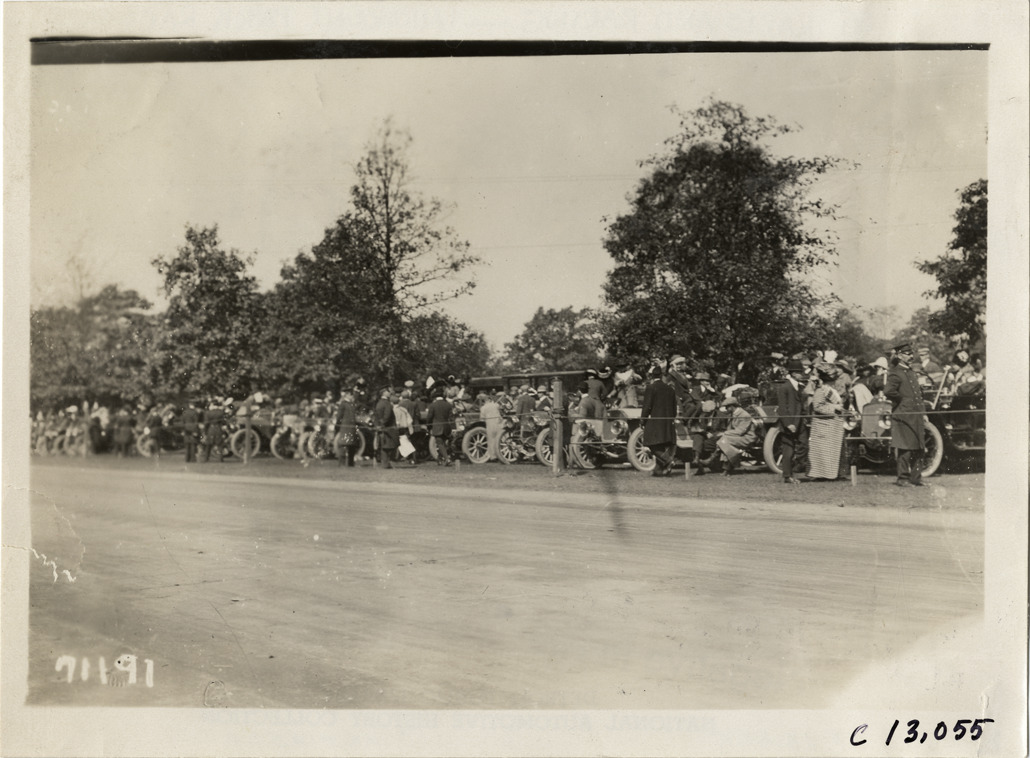 View of spectators with their cars on roadside during the 1911 Fairmount Park races in Philadelphia, Pennsylvania. Stamped on back: "Spooner & Wells, Inc., photographers, telephones 3472-3473 Columbus, 1931 Broadway, New York." Handwritten on back: "Races and racing--Fairmount Park races, 1911."