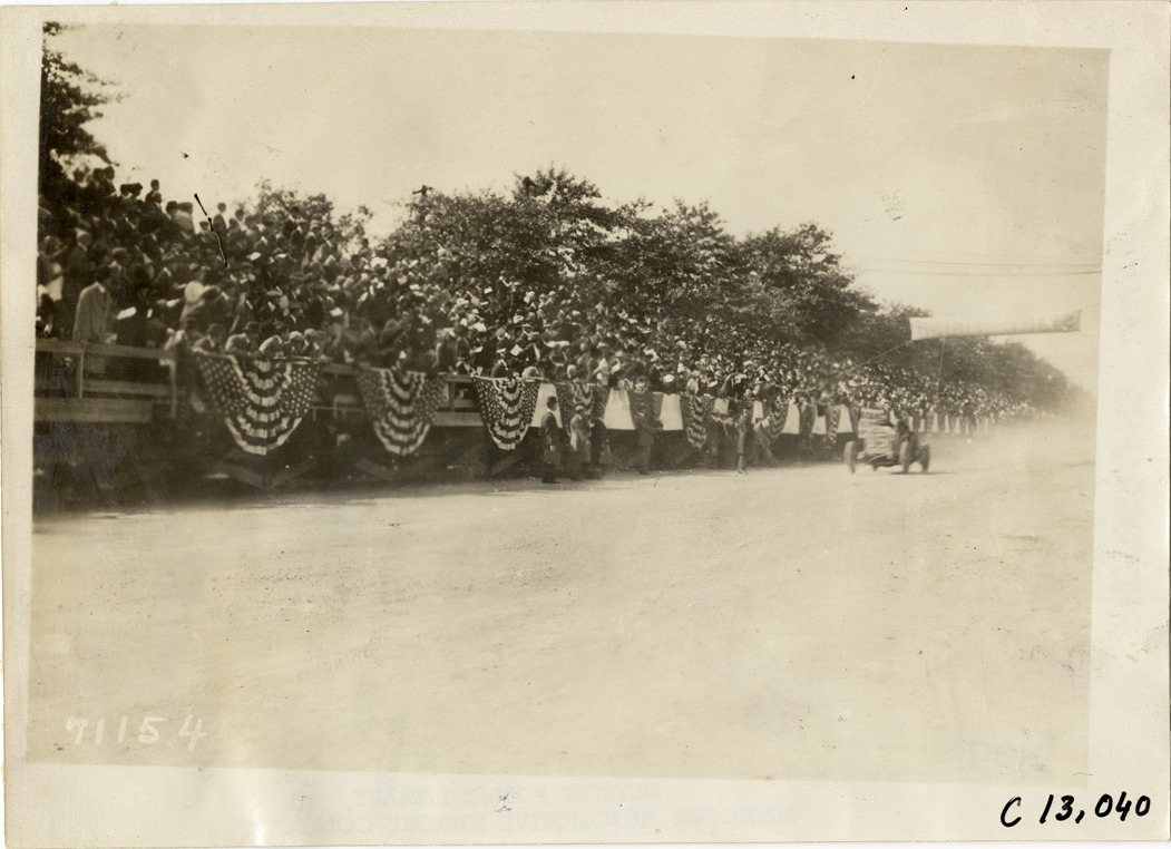 View of crowd of spectators in stands during the 1911 Fairmount Park races in Philadelphia, Pennsylvania. J. Fred Betz races Fiat car no. 15 past stands; bleacher railing is decorated with bunting. Stamped on back: "Spooner & Wells, Inc., photographers, telephones 3472-3473 Columbus, 1931 Broadway, New York." Handwritten on back: "J.F. Betz. Races and racing--Fairmount Park races, 1911."