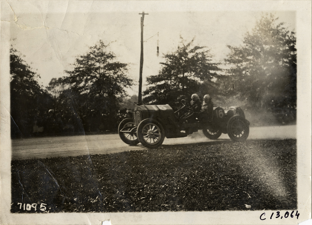 View of Louis Disbrow and passenger racing National car no. 16 on course during the 1911 Fairmount Park races in Philadelphia, Pennsylvania. Spectators watch from roadside. Stamped on back: "Spooner & Wells, Inc., photographers, telephones 3472-3473 Columbus, 1931 Broadway, New York." Handwritten on back: "Disbrow. Races and racing--Fairmount Park races, 1911."