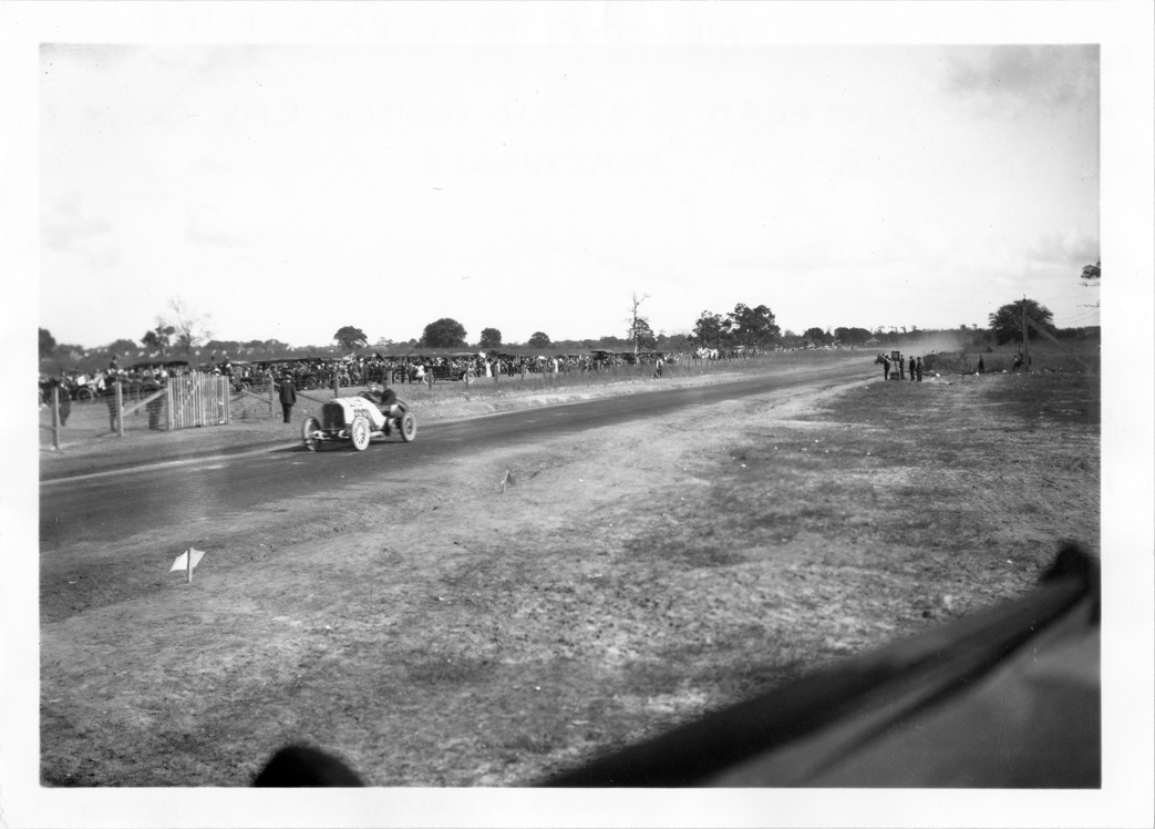 View of H.S. Matthews and passenger racing Ohio car no. 19 on course during the 1911 Fairmount Park races in Philadelphia, Pennsylvania. Spectators watch from roadside. Handwritten on back: "#19 Ohio, entered by Ohio Motor Car Co., driven by H.S. Matthews. Races and racing--Fairmount Park races, 1911."