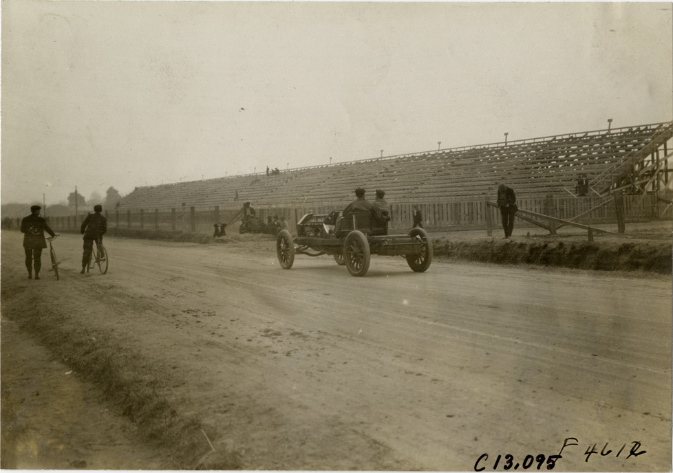 Rear view of driver and passenger in Apperson car driving past empty bleachers during the 1908 Grand Prize races in Savannah, Georgia. Two men with bicycles stand on left. Stamped on back: "Photo by N. Lazarnick, 29 West 42nd Street, N.Y., tel. 594 Bryant." Handwritten on back: "Grand stand with Apperson going by. Races and racing--Grand Prize races, 1908."