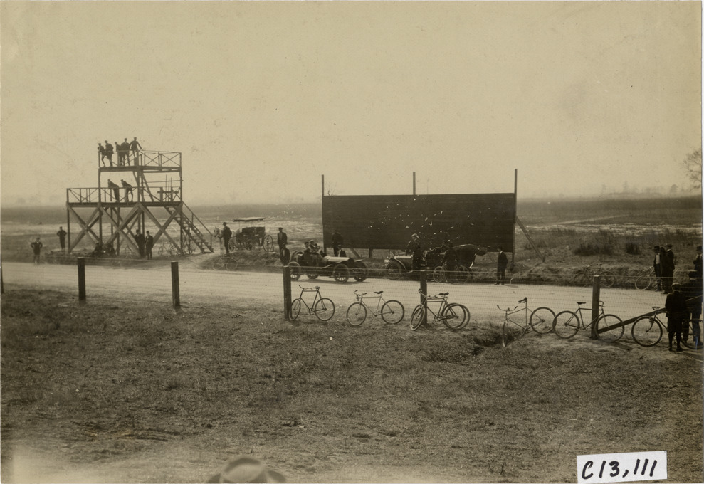 View of timers' stand and tally board during the 1908 Grand Prize races in Savannah, Georgia. Row of bicycles lean against fence in foreground. Stamped on back: "Photo by N. Lazarnick, 29 West 42nd Street, N.Y., tel. 594 Bryant." Handwritten on back: "Timers stand & tally board. Races and racing--Grand Prize races, 1908."
