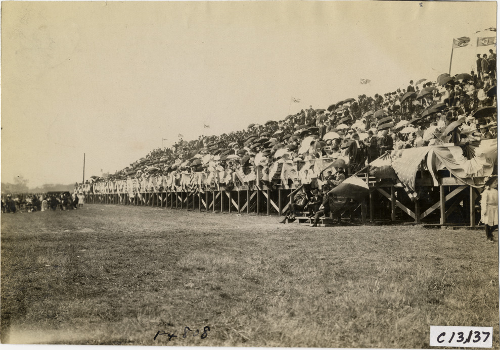 View of crowd sitting in bleachers during the 1908 Grand Prize races in Savannah, Georgia. Stamped on back: "Photo by N. Lazarnick, 29 West 42nd Street, N.Y., tel. 594 Bryant." Handwritten on back: "Grand stand. Races and racing--Grand Prize races, 1908."