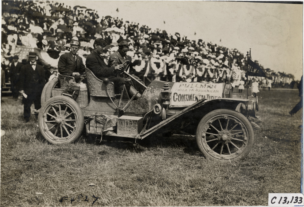 View of motorists posing in Pullman car, which traveled from Philadelphia to Savannah, parked in front of crowd in grandstand at the 1908 Grand Prize races in Savannah, Georgia. "Pullman" flags and "Pullman, Phila. to Savannah, Continental tires" banner displayed on car. Stamped on back: "Photo by N. Lazarnick, 29 West 42nd Street, N.Y., tel. 594 Bryant." Handwritten on back: "Races and racing--Grand Prize races, 1908."