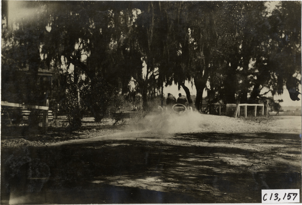 Rear view of driver and passenger racing car on course during the 1908 Grand Prize races in Savannah, Georgia. Trees and house in background. Stamped on back: "Photo by N. Lazarnick, 29 West 42nd Street, N.Y., tel. 594 Bryant." Handwritten on back: "Races and racing--Grand Prize races, 1908."