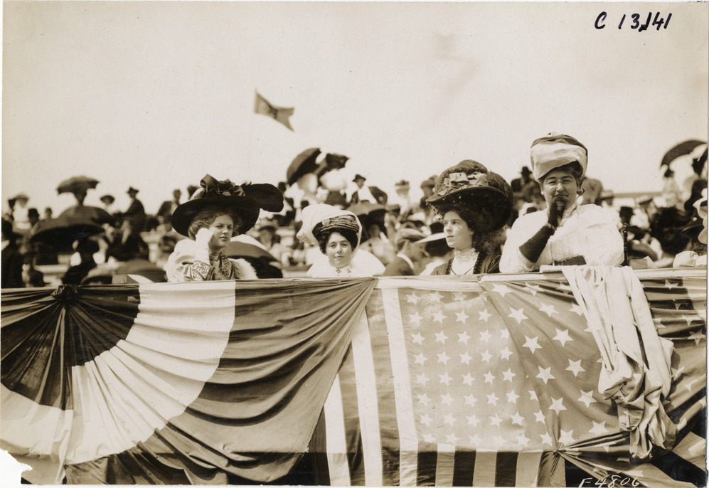 Close-up view of four women in bleachers during the 1908 Grand Prize races in Savannah, Georgia. Grandstand railing is decorated with American flags and bunting. Handwritten on back: "Races and racing--Grand Prize races, 1908."