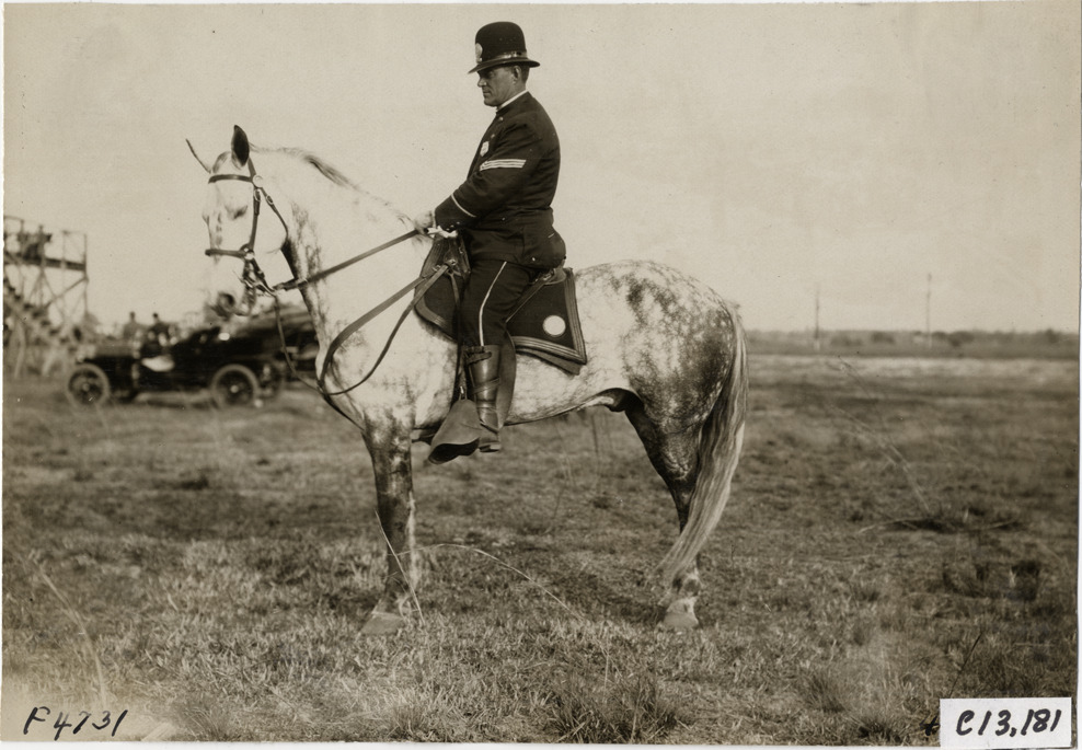 View of police officer on horseback during the 1908 Grand Prize races in Savannah, Georgia. Stamped on back: "Photo by N. Lazarnick, 29 West 42nd Street, N.Y., tel. 594 Bryant." Handwritten on back: "Cop on course. Races and racing--Grand Prize races, 1908."