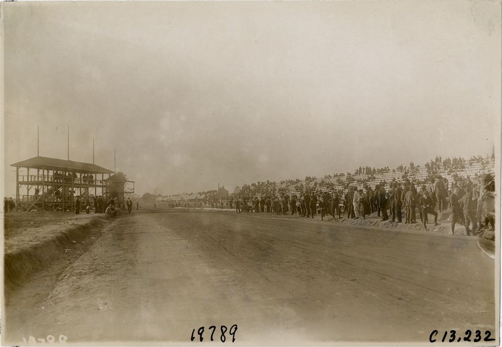 View of racetrack during the 1908 Grand Prize races in Savannah, Georgia, showing spectators and bleachers. Stamped on back: "Photo by N. Lazarnick, 29 West 42nd Street, N.Y., tel. 594 Bryant." Handwritten on back: "Races and racing--Grand Prize races, 1908."