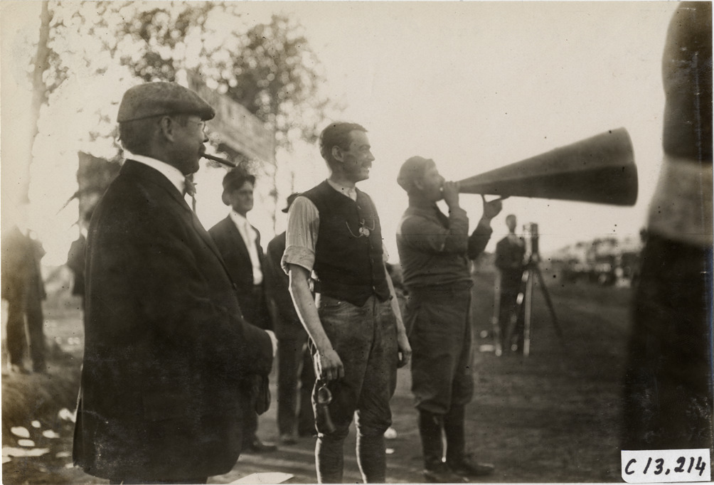 Favorite this☆ Announcer with megaphone, 1908 Grand Prize races Description: View of announcer speaking into megaphone during the 1908 Grand Prize races in Savannah, Georgia. Racecar driver and man smoking a cigar in foreground. Handwritten on back: "Races and racing--Grand Prize races, 1908." Details Resource ID: na012691 Subject: Racetrack announcers--Georgia--Savannah Megaphones--Georgia--Savannah Automobile racing drivers--Georgia--Savannah Automobile racing--Georgia--Savannah Photographic prints Date Issued: 1908 Format: 1 photographic print ; 4.75 x 6.75 in. Member of: National Automotive History Collection Lazarnick Collection Filing Location: Races and racing--Grand Prize Races, 1908 #5 Negative Number: Negative #C13,214 Rights: Physical rights are retained by DPL. Copyright is retained in accordance with U.S. copyright laws.