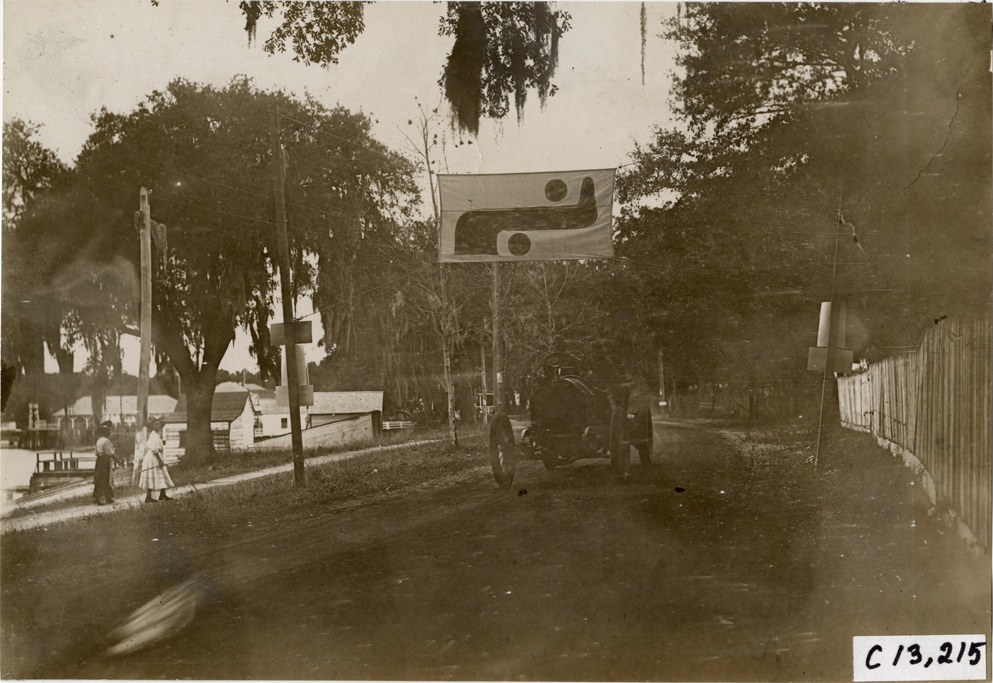 View of driver and passenger racing car on course during the 1908 Grand Prize races in Savannah, Georgia. Banner is suspended over road. Handwritten on back: "Races and racing--Grand Prize races, 1908."