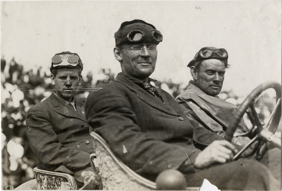 P.F. Gillette and two unidentified men in Pullman automobile, 1908 Grand Prize races