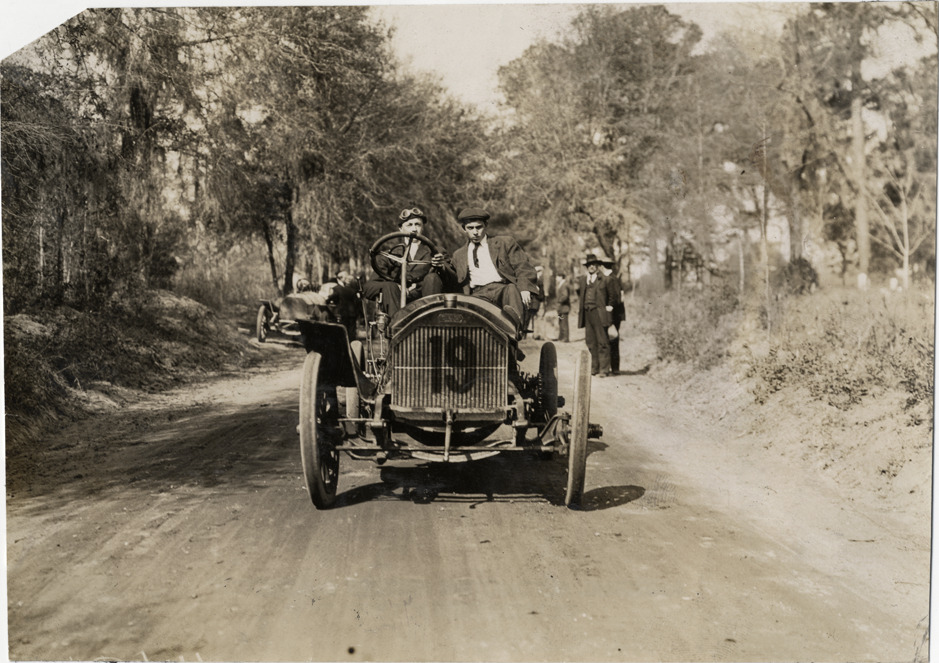 Front view of William McCulla and passenger in Apperson car no. 19 during the 1908 Grand Prize races in Savannah, Georgia. Handwritten on back: "Apperson w/ McCullo [sic] who succeeded Hardy. Races and racing--Grand Prize races, 1908."
